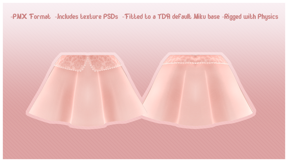 A modeled from-scratch MMD skirt. Includes the PMX file, alternate color textures, PSDs for the original textures, and a UV atlas for helping to make new textures!